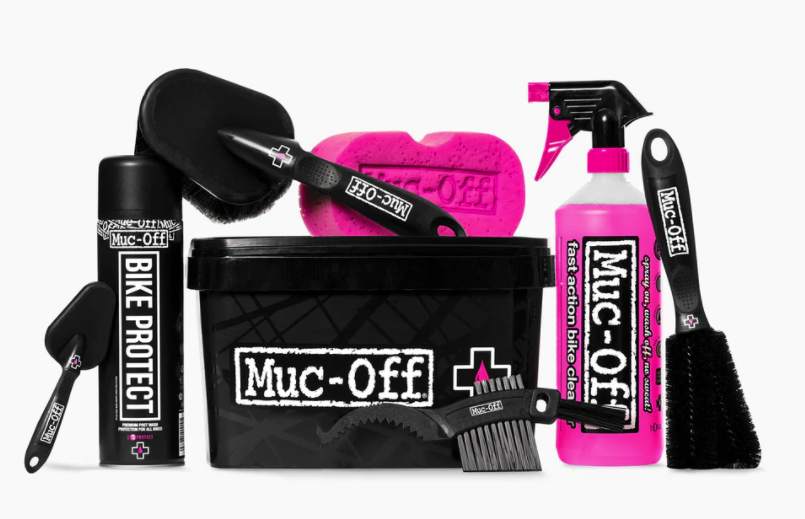 Muc-Off 8-in-1 Cykelrengøring kit Dette er det perfekte sæt til rengøring af din cykel. Der er både Muc-Off’s Nano Tech Bike Cleaner, Udvidende Microcell Svamp, Soft vaskebørste, Detalje børste, Claw børste, Two Prong børste, Bike Spray og opbevaringskasse