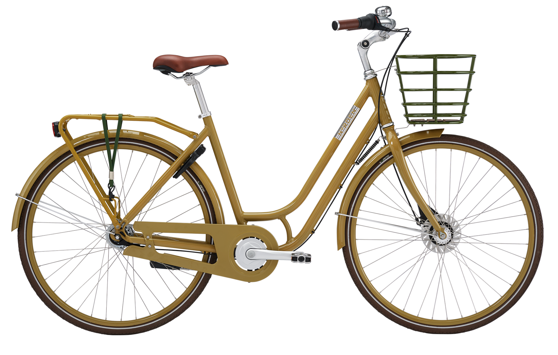 Du får 7 indvendige Shimano-gear samt både fodbremse og rullebremse. Leveres med kurv, bagagebærer/strop, støtteben, retroklokke, LED-baglygte, antipunkteringsdæk med refleks og godkendt lås.